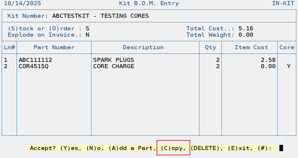 The kitting BOM entry program now has a copy feature. The feature will create a copy of an existing kit record to a new kit record then display the new kit record for editing and saving.