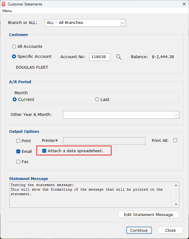 Emailed customer statements can now include a spreadsheet style formatted file with the current pdf file. The customer statement program now has an option to include the spreadsheet file when selected, and the customer document management now has a switch to include the spreadsheet file whenever a statement is sent by email.